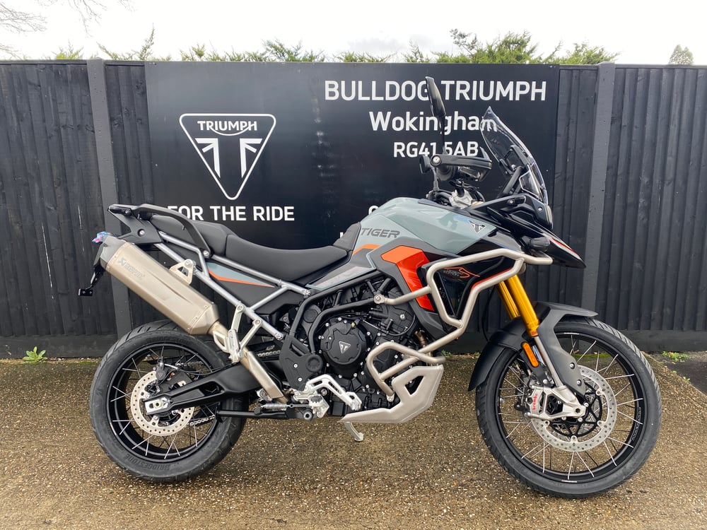 This is the new 2026 Triumph Tiger 900 Desert Edition that we have in stock and available now. The Desert Edition builds on the huge success of the Tiger 900 which proven to be one of the most popular middle weight adventure bikes with its' low centre of gravity, punchy T-Plane crank triple engine, great specification and mangle weight it suits many riders. This is the more off road styled Rally model that has the longer travel suspension and spoked wheels. This is the latest spec bike with more power, a smoother engine, comfier seats and refined electronics from the previous version. This Desert edition has a massive specification including heated Grips, Fog lights, Engine bars, Bluetooth connectivity, Up & Down blipper/ quickshifter, Hand Guards, sumpguard, Riding modes, Traction control, switchable ABS, Cruise control, TFT display, Centre stand, adjustable screen and even a handy compartment with a USB socket under the seat to charge your phone. The Desert also features the striking paint scheme, Ackrapovic silencer and upper engine bars. This is a fully on the road price with the 2 year warranty, roadside assistance, Datatag secure markings, a labour free 600 miles service with us and even a tank of fuel.